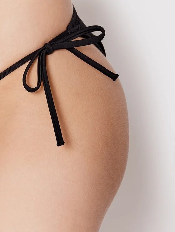 Juodos vientisos spalvos maudymosi audinys, puoštas elegantišku, aukštosios mados įkvėptu blizgių auksinių grandinėlių motyvu.
