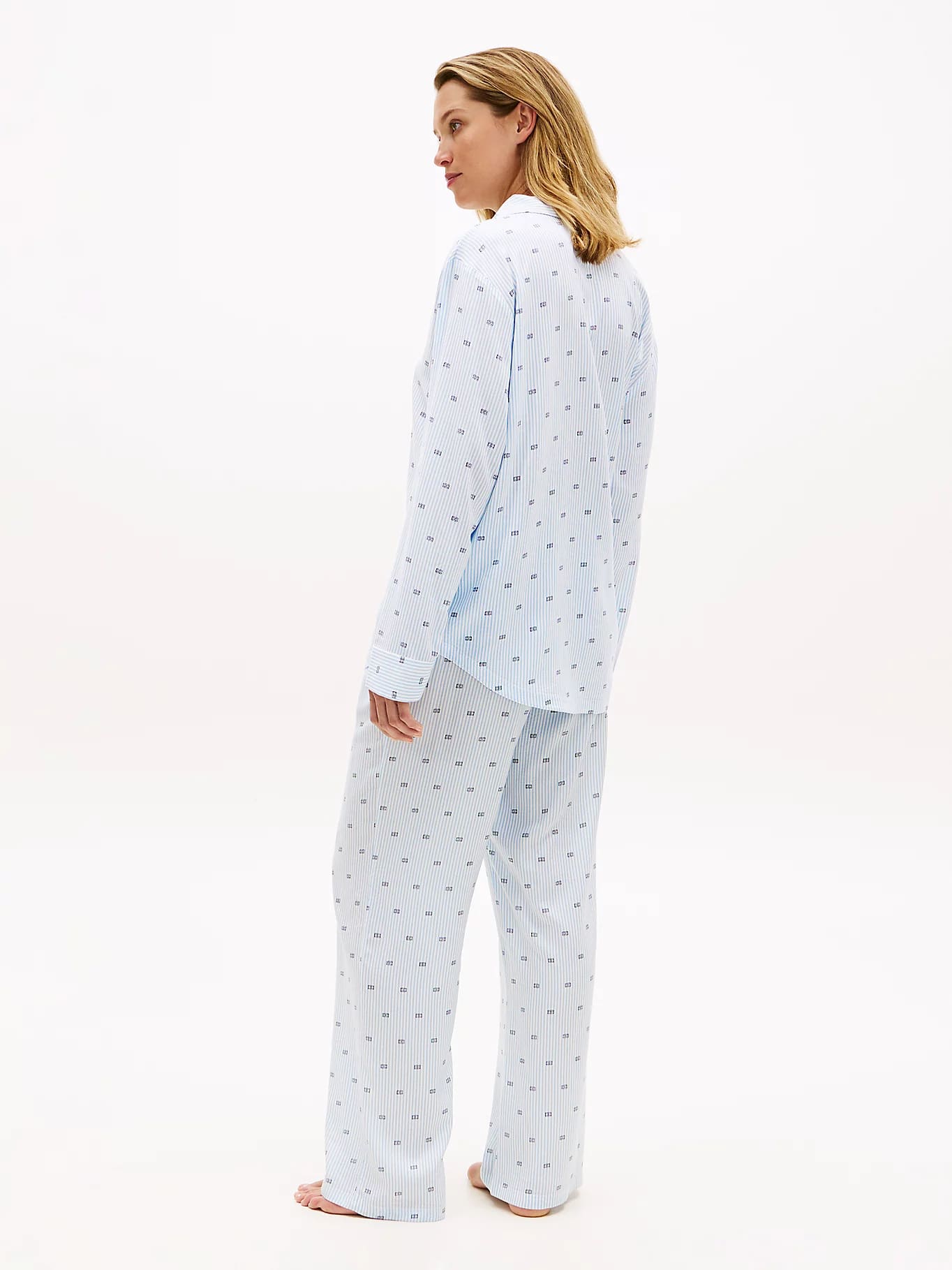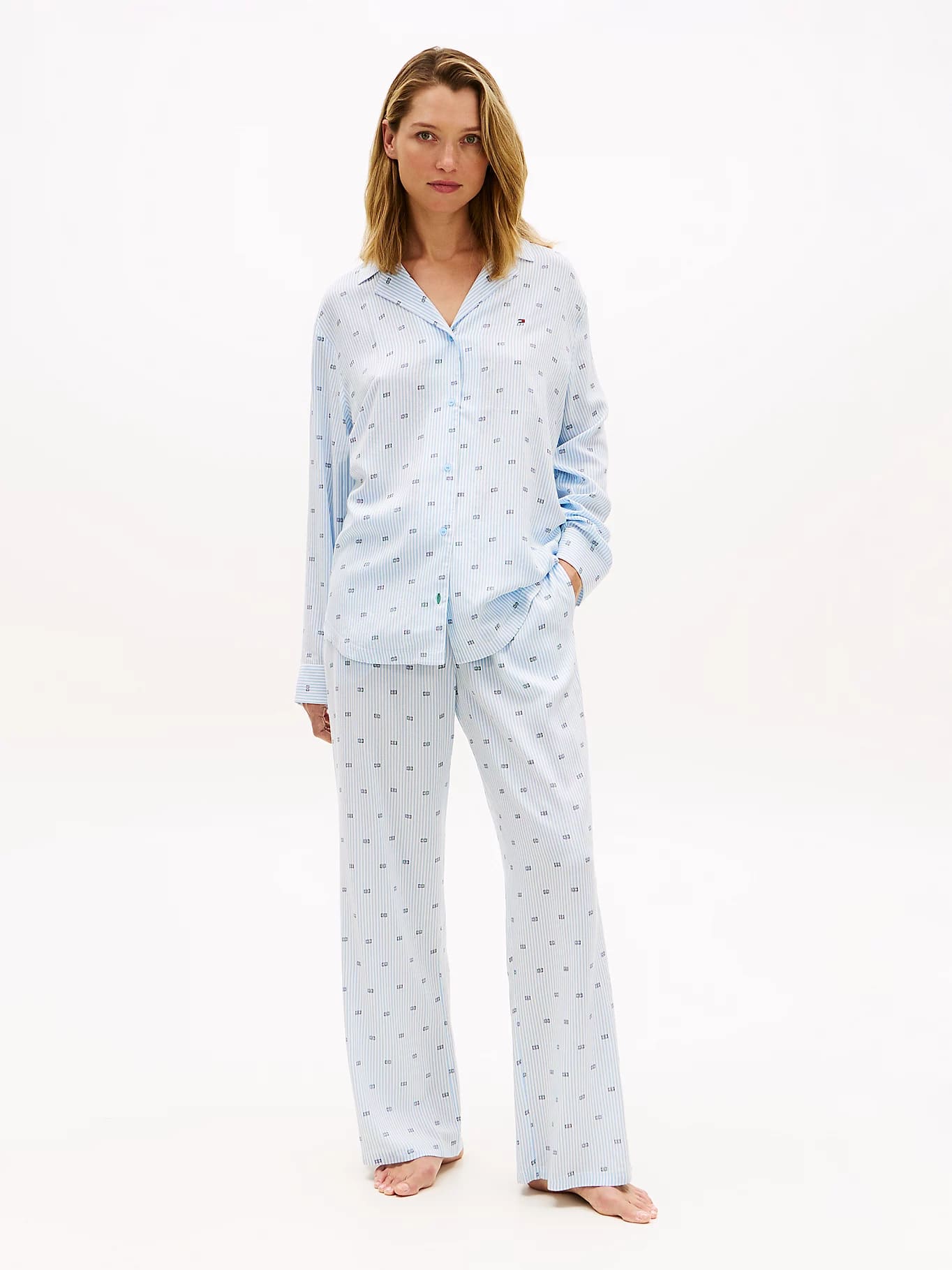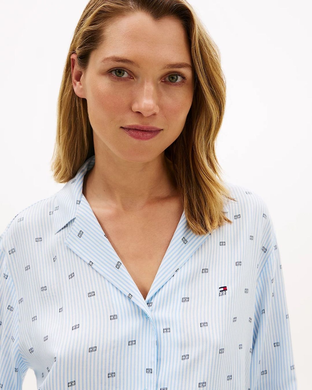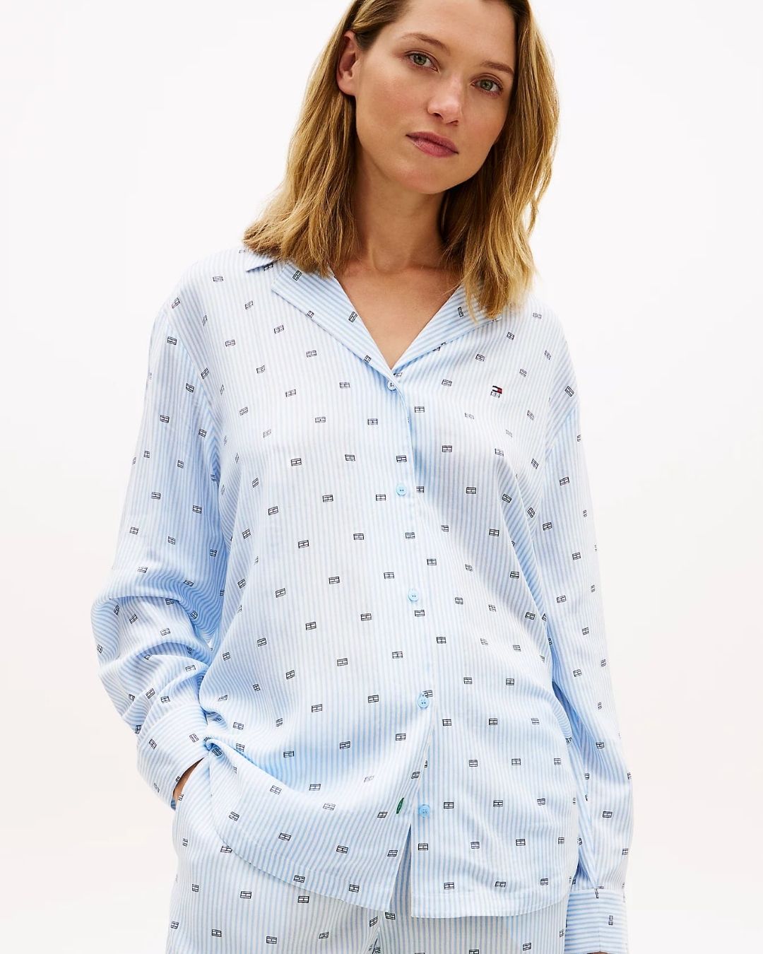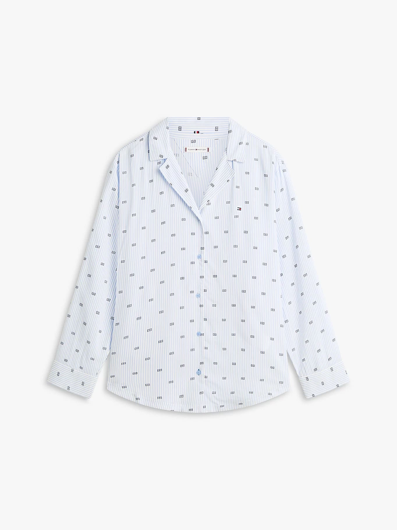 Šie klasikiniai pižamos marškiniai pasiūti iš lengvai krentančio audinio, pasižymi nesenstančiu dizainu su apykakle ir išsiskiria akį traukiančiu raštu visame paviršiuje.