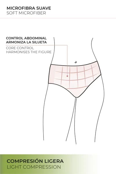 Formuojančios kelnaitės su pilvo ir klubų srities kontrole. Apatinėje pilvo dalyje įsiūta papildoma sutvirtinimo detalė, padedanti sukurti lygesnio, plokštesnio pilvo efektą.