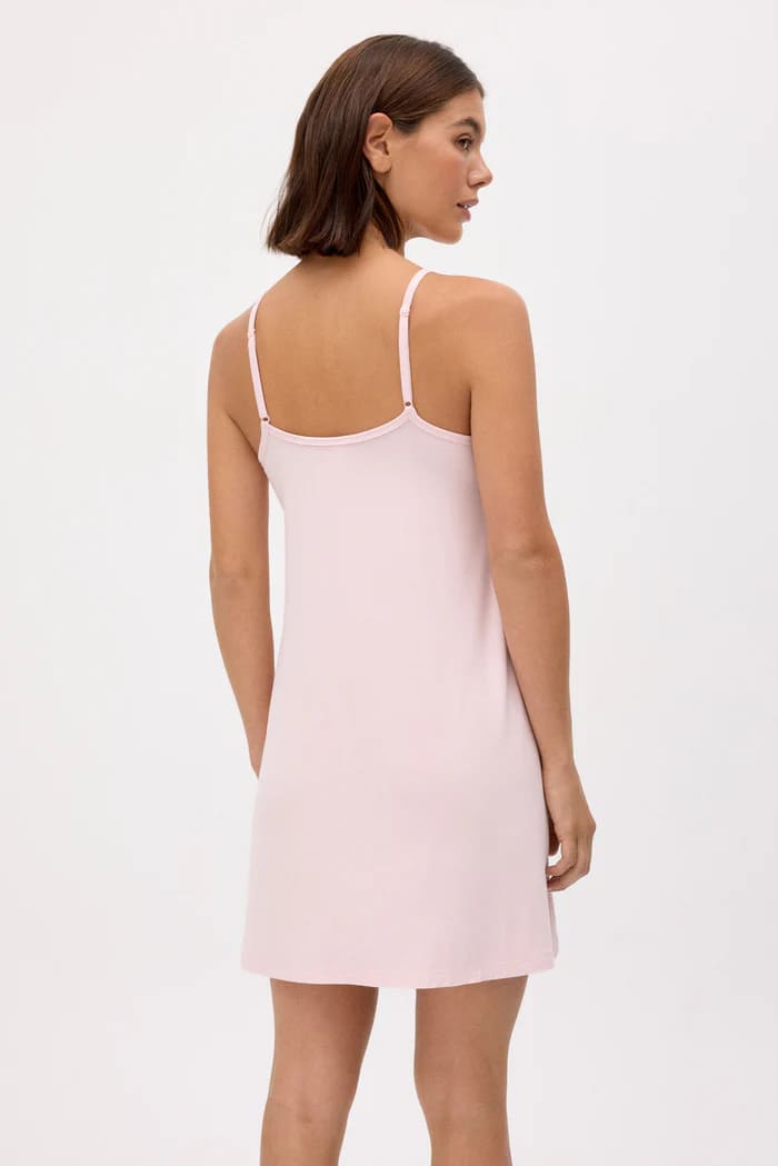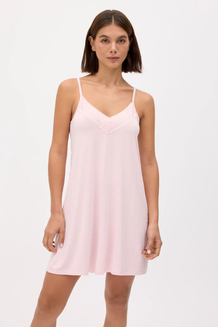 Trumpi viskoziniai naktinukai su plonomis, reguliuojamo ilgio petnešėlėmis. Iškirptė dekoruota nėriniais, suteikiančiais lengvumo ir švelnumo pojūtį.